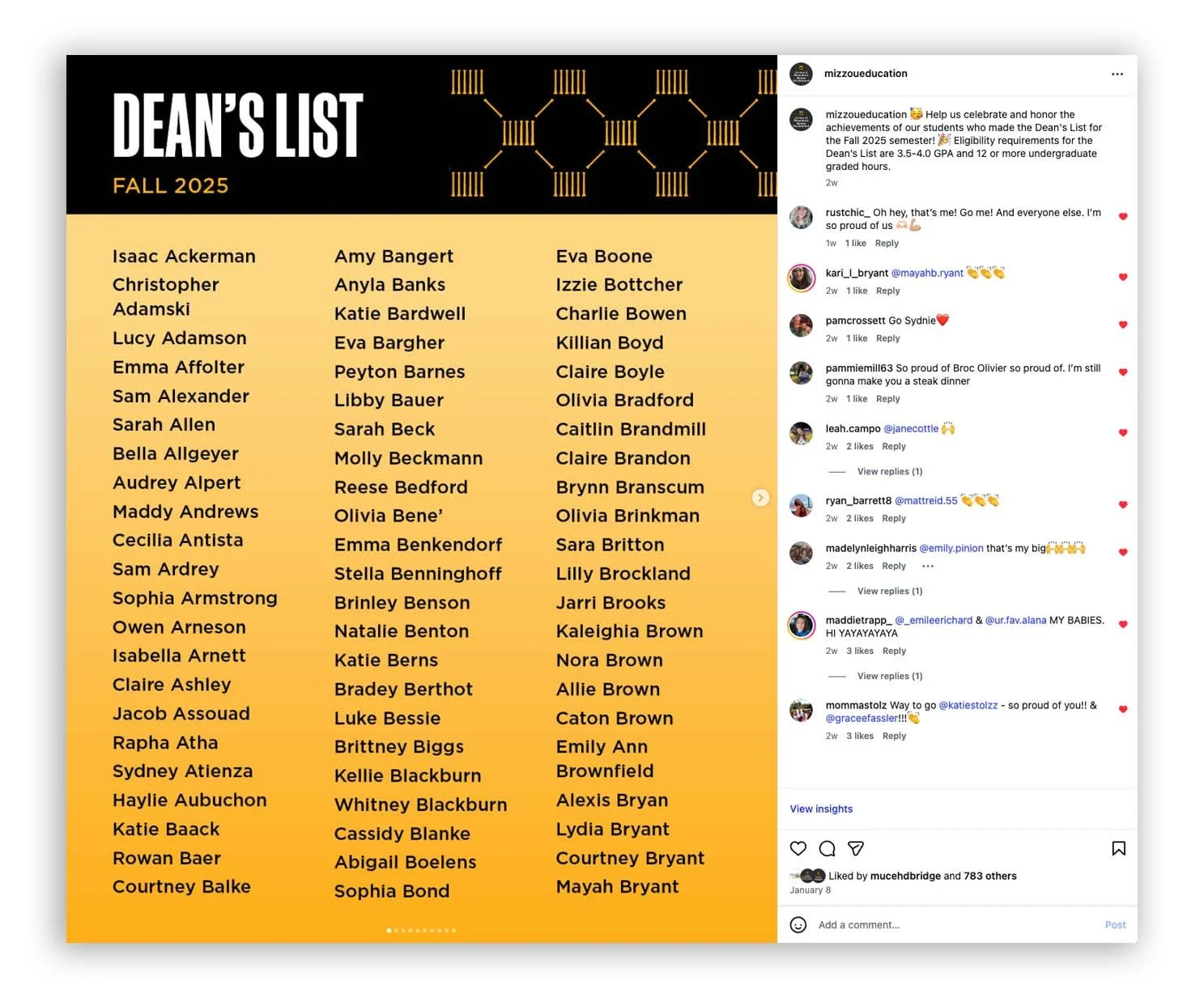 Fall 2025 Dean’s List post reached 61K+ users with 13%+ engagement.